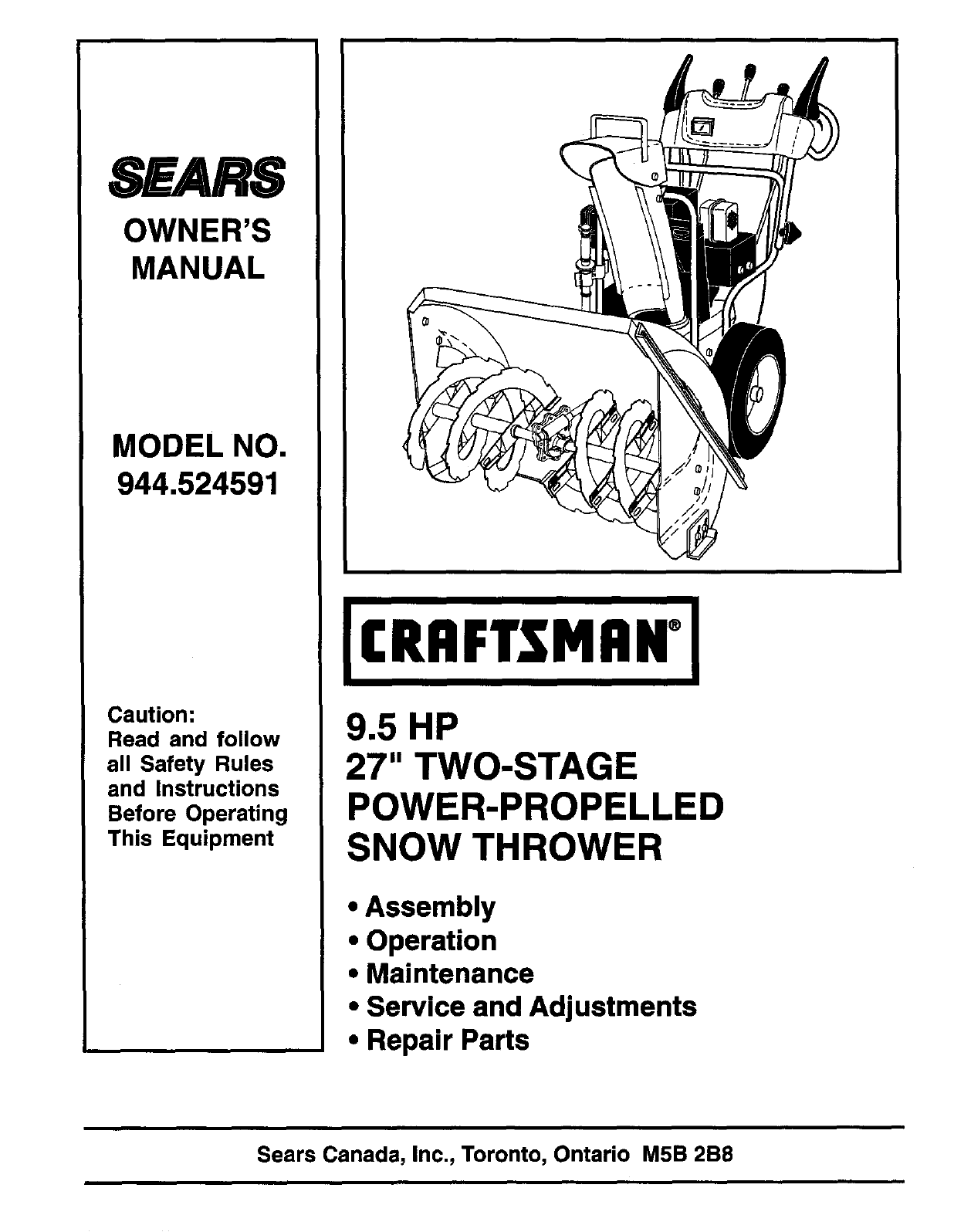 SEARSOWNER'SMANUALMODEL NO.944.524591Caution:Read and followall Safety Rulesand InstructionsBefore OperatingThis EquipmentICRIIFT.TMIIN°[9.5 HP27
